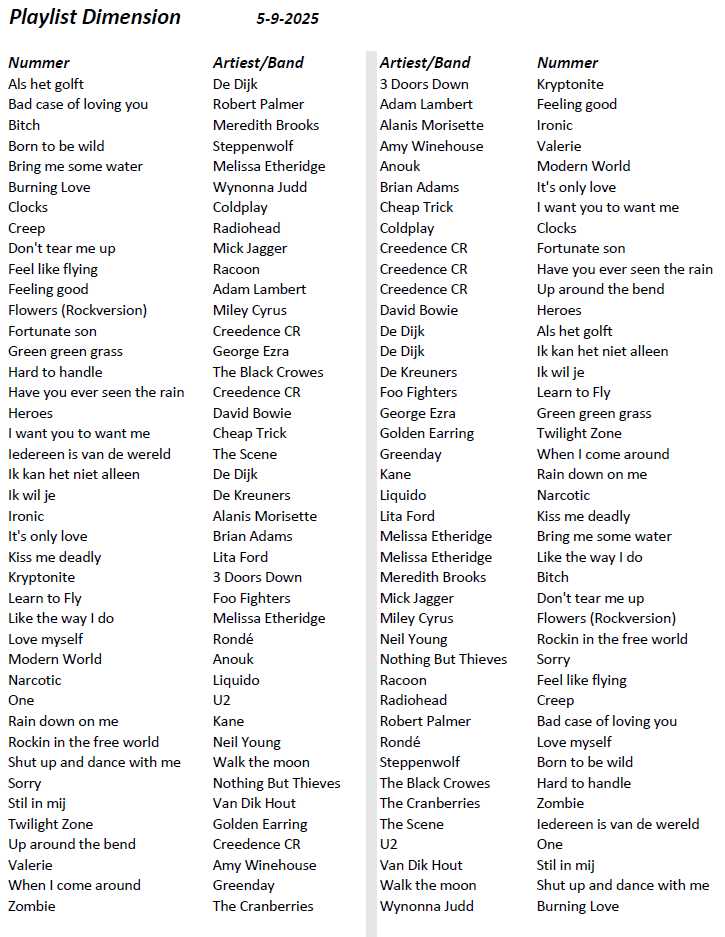 Hieronder zie je onze actuele playlist. Dit is een dynamische lijst omdat we (qua uitdaging) continue bezig zijn met nieuwe nummers en dus ook nummers laten vallen.